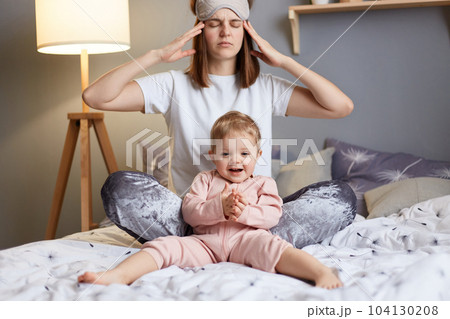 Portrait of of unhealthy woman mother wearing pajama and blindfold with her baby daughter in the bedroom sitting on bed, female suffering headache due to lack of sleep.