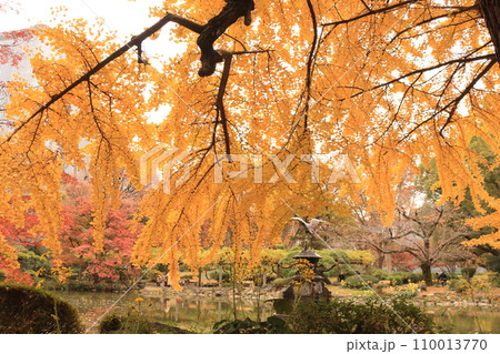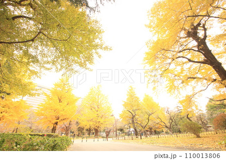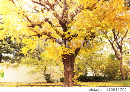 秋の公園の黄色い銀杏の木