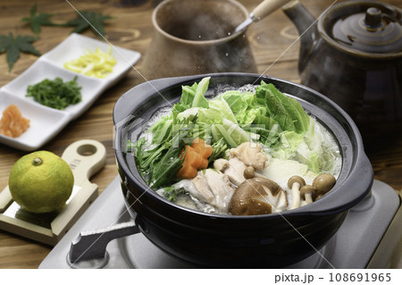 冬の味覚 鶏の水炊き 鍋料理 柚子を添えて