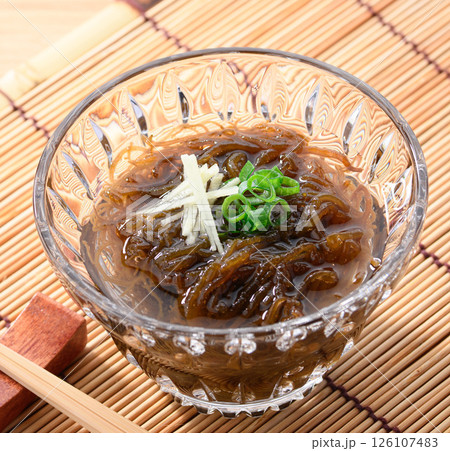 もずく酢(青ネギトッピング)。背景、すだれ。