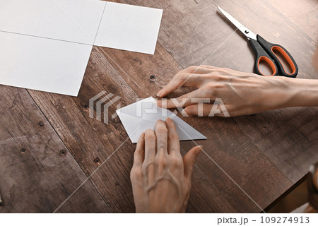 hands of an elderly woman fold origami paper. Creating an origami paper crane