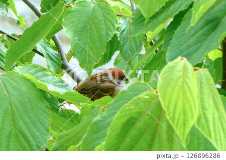 葉っぱの茂みに隠れる雀の幼鳥
