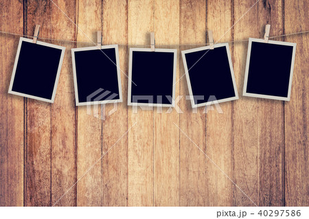 Photo frames hanging on rope attached with clothes pins or clothespin. Blank instant photo card icons isolated on white background
