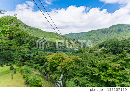 那須塩原の「森林の駅/もみじ谷大吊橋」から見た青い空と塩原ダム湖