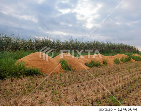 秋、米の収穫後のもみ殻の山