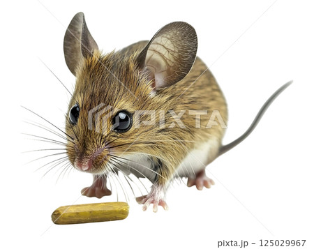 Adorable house mouse with large eyes, poised near a seed. Perfect for illustrating themes of nature, wildlife, small animals, or even food.