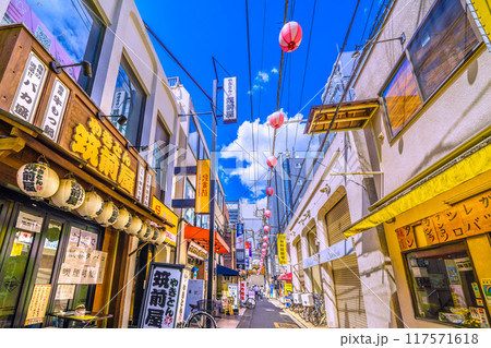 日本の東京都市景観 8月。三軒茶屋駅すぐの飲み屋街「すずらん通」などを望む