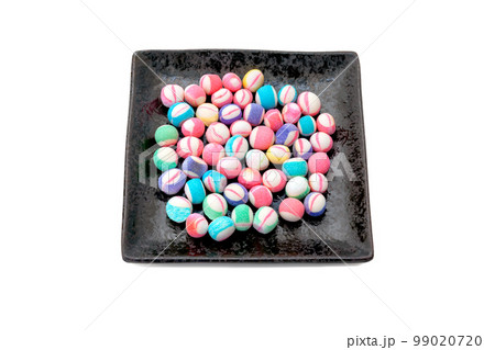 皿に乗せたカラフルな手毬麩【白背景・切り抜き】