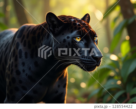 Intense Gaze of Black Jaguar Highlighting Spotted Coat and Muscle Detail Under Amazon Rainforest Light