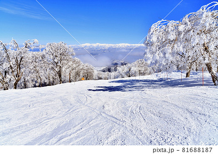 長野県下高井郡にある冬季野沢温泉スキー場の毛無山から観える景色