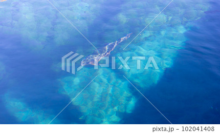 Winter snow mountain panorama. panoramic aerial view above sea and snow covered frozen mountains with deep blue sky and a beautiful radiant sun. Cold weather and climate change