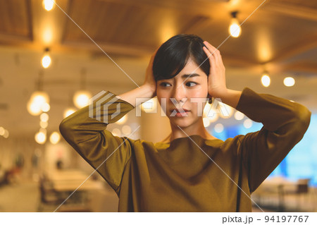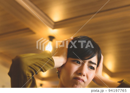頭を抱えるミドル女性 きれいなミドル女性 奥様