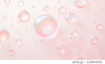 マットなパステルピンク背景、半透明の浮遊バブル付き