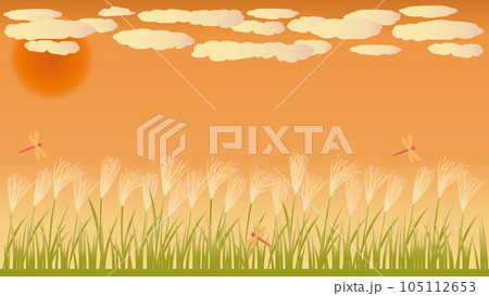 ススキと赤とんぼと夕暮れの秋をイメージしたイラスト アスペクト比16:9バージョン
