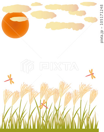 ススキと赤とんぼと夕暮れの秋をイメージしたイラスト 縦書きバージョン