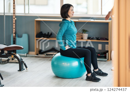 スポーツジムに通いバランスボールで体幹を鍛える女性