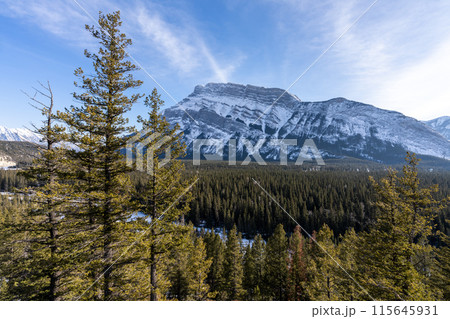 Banff National Park, Canadian Rockies beautiful scenery. Snowcapped Mount Rundle, fir trees forest in snowy winter day.