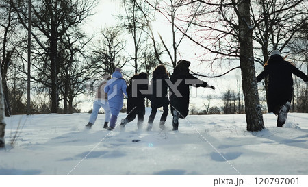 Group of schoolgirls running through snowy winter forest, enjoying their free time outdoors