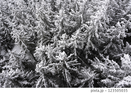 Aerial top view winter forest with fresh snow and white trees in Dolni Morava