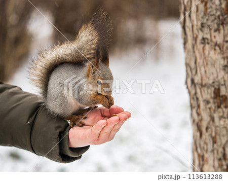 Squirrel eats nuts from a man's hand. Caring for animals in winter or autumn.