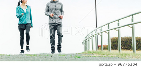 公園で景色を見ながらウォーキングするスポーツウェアを着た男女(夫婦・カップル)
