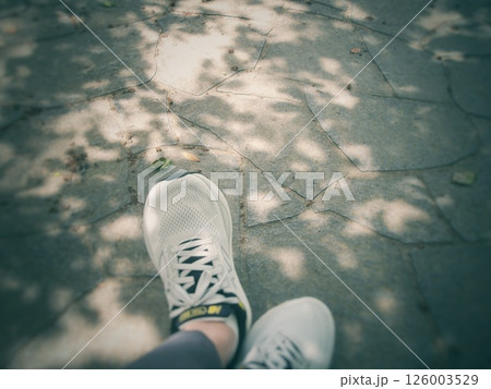 ウォーキングするスポーツウェアを着たアジア人男女の足元(夫婦・カップル)