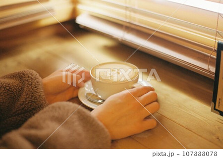 窓辺でコーヒーを飲む女性