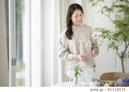 花瓶の置かれたダイニングテーブル 窓辺 花のある暮らし イメージ