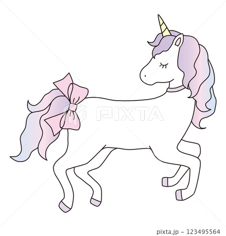 リボンをつけたかわいいユニコーンのベクターイラスト。馬、動物、ドリーミー、線
