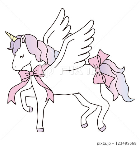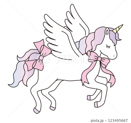 かわいいユニコーンのベクターイラスト。馬、動物、リボン、ドリーミー、羽、ペガサス、線