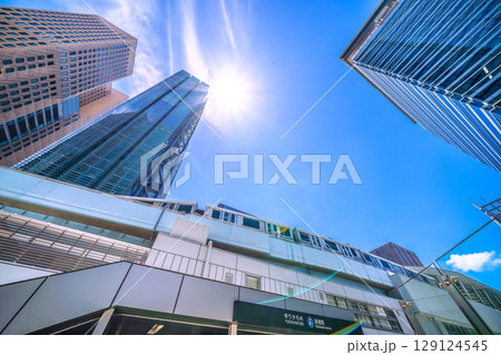日本の東京都市景観 新風景…暑い…汐留のビジネス街や太陽光、ゆりかもめ、汐留駅…希望の光=7月20日