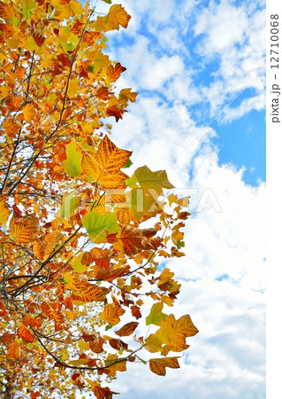 逆光の紅葉し始めたユリノキの枝葉と青空 横長