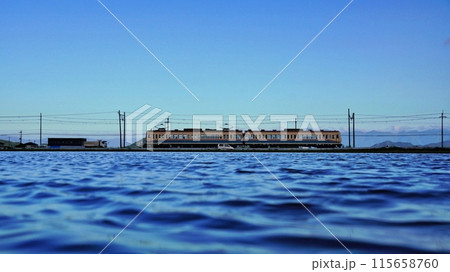 富山湾の雨晴海岸から残雪の立山連峰と上空にぽっかいりと浮かぶを背景に海岸線を走るJR氷見線の気動車