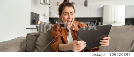 Portrait of woman looking at digital tablet with worried, stressed and upset face, losing in video game, sitting at home on couch