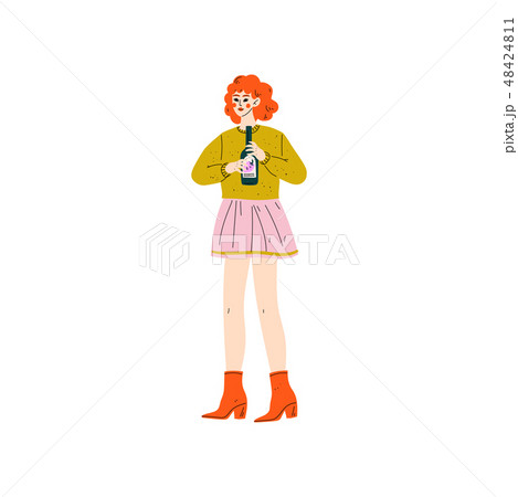 Young Woman in Casual Clothes Standing with Bottle of Alcohol Drink Vector Illustration