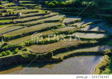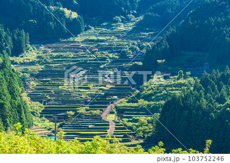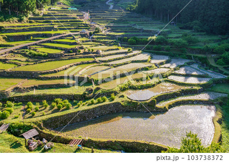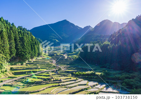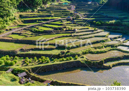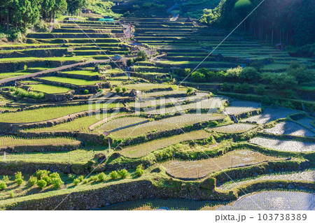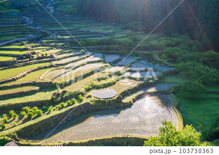 【愛知県】田植えが終わった四谷の千枚田・早朝の日差し