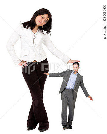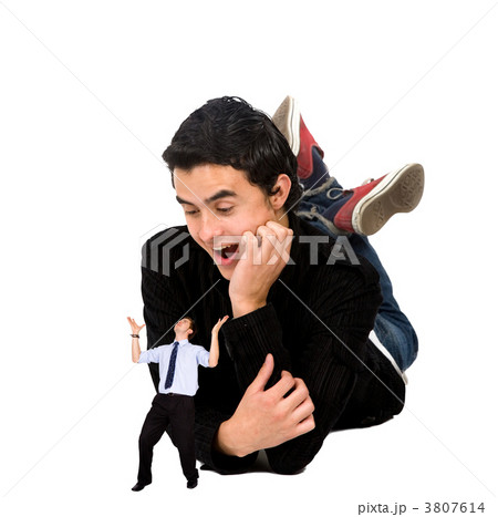 Large bearded person gestures, while a smaller person on a cube is engrossed with a phone and a framed picture of mountains and sun. Ideal for communication, technology, creativity, motivation