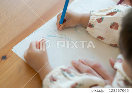お絵描きする親子の手元