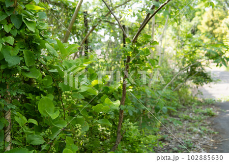 実が付いたサルトリイバラが絡む道端の風景【サンキライ】初夏・埼玉県