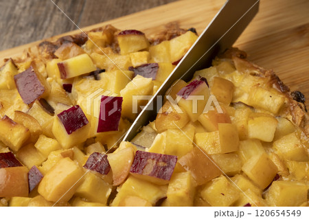焼きたてのさつま芋とりんごのキッシュを包丁で切る
