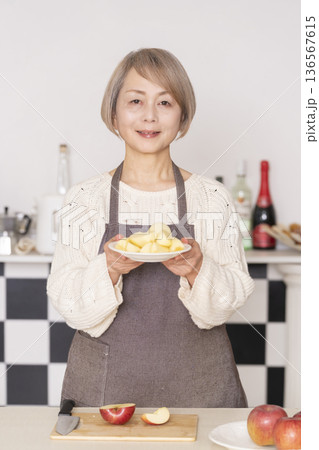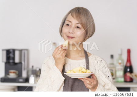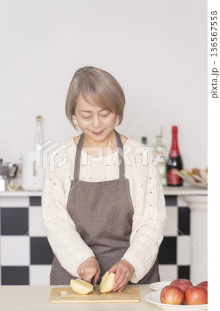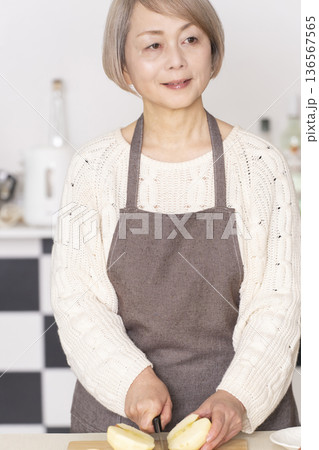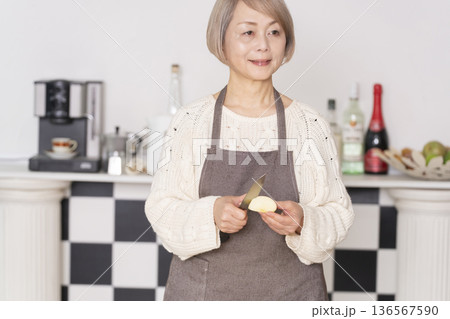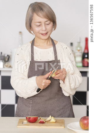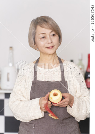 キッチンでりんごの皮をむくシニア女性