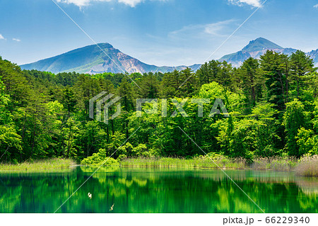 五色沼自然探勝路の新緑風景 るり沼と磐梯山 福島県北塩原村
