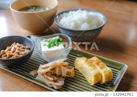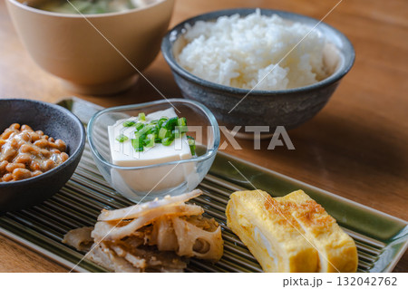 納豆や卵焼き、味噌汁とごはんが並ぶ健康的な和朝食