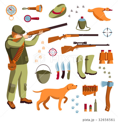 Hunting equipment rest hunter camouflage woodland flat set. Camping goods for forest hobby active sport wild adventure object nature. Miscellaneous weapon trap clothes vector illustration isolated