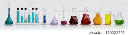 Measure glass cups and containers, laboratory beakers and chemistry flasks, realistic vector. Lab equipment and test glassware, isolated chemical tubes and measuring cylinders and vial cups