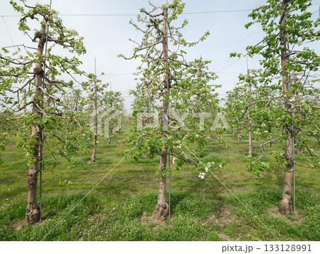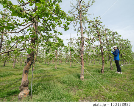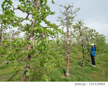 高密植栽培のりんご園で摘花をする農家