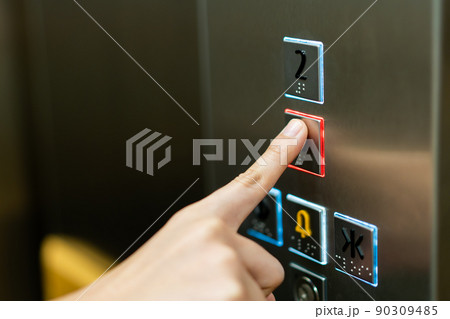 People pressing the button in the lift and select the first floor by using the forefinger. Elevator control panel in small building close up. Bell alphabet on the button in the passenger lift.