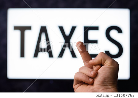 Taxes reform. Frustrated man showing middle finger to a screen with inscription TAXES