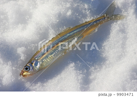 糸にかかったワカサギ,冬,朝
