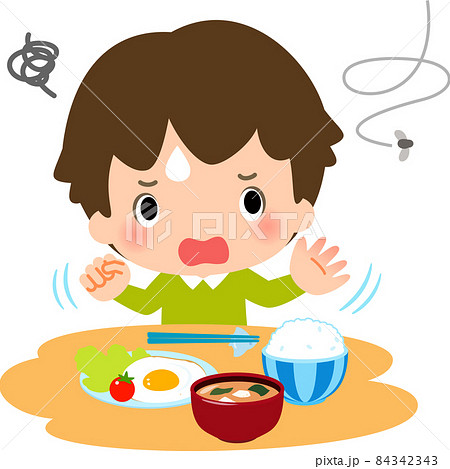 食卓でハエを追い払う男の子